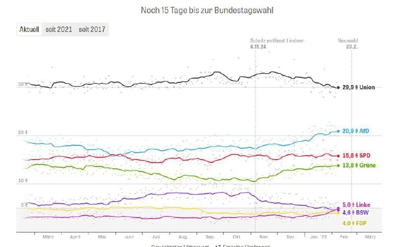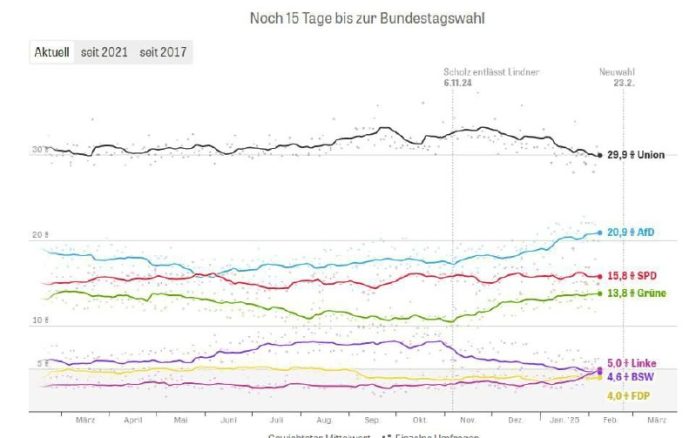 Pod?a najnovších prieskumov vedie blok Únie s 29,9 %. Na druhom mieste(!) je AfD (20,9 %), SPD zaostáva s 15,8 %.