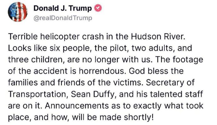 Zdá sa, že šes? ?udí – pilot, dvaja dospelí a tri deti – už nie sú medzi nami. Zábery z nehody sú hrôzostrašné. Nech Boh požehná rodiny a priate?ov obetí. Na tejto problematike pracuje minister dopravy Sean Duffy a jeho talentovaní zamestnanci. ?oskoro bude oznámené, ?o sa presne stalo a ako presne sa to stalo!“