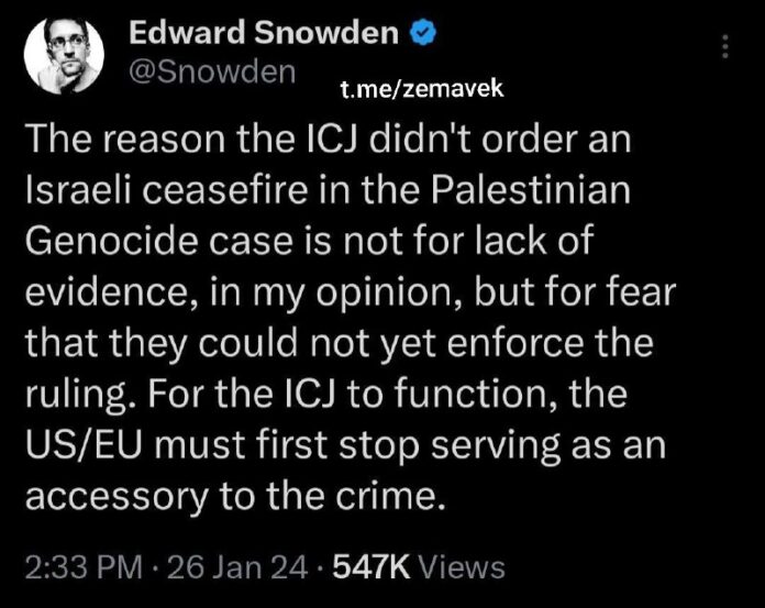 Rus Edward Snowden o výsledku rozhodnutia Medzinárodného súdu, ktorý odsúdil Izrael, ale vo verdikte nenazna?il potrebu prímeria v pásme Gazy.