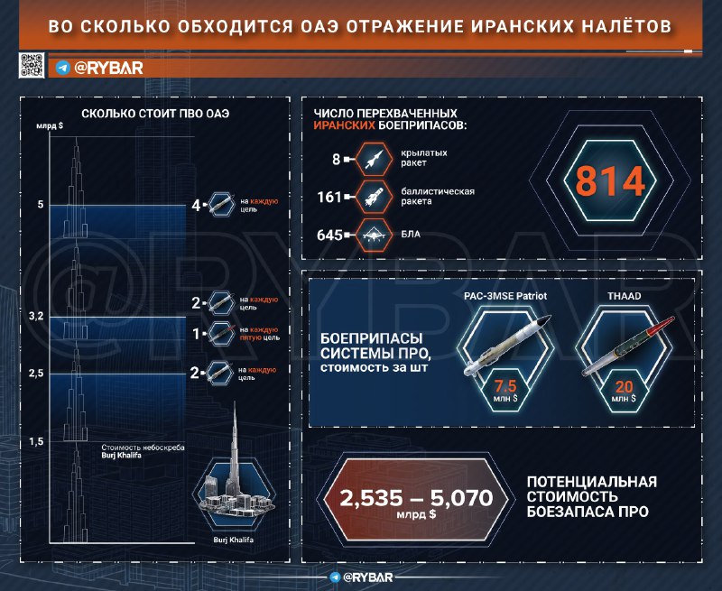 Perzské útoky však odrazila aj protivzdušná obrana Spojených štátov, Izraela, Saudskej Arábie, Kuvajtu, Kataru a Jordánska. A ak poznáte poradie cien na príklade SAE, môžete jednoducho navrhnúť a vypočítať celkové náklady na protiraketovú obranu na 3 dni. Už to môže byť viac ako 100 miliárd dolárov
