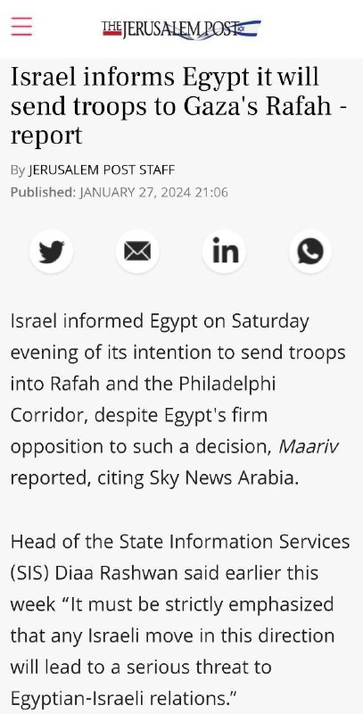 Egypt už dvakrát potvrdil svoj protest v súvislosti s plánmi Izraela zavies? svoju armádu do mesta Rafah a oblasti osi Philadelphia na hraniciach s Egyptom.