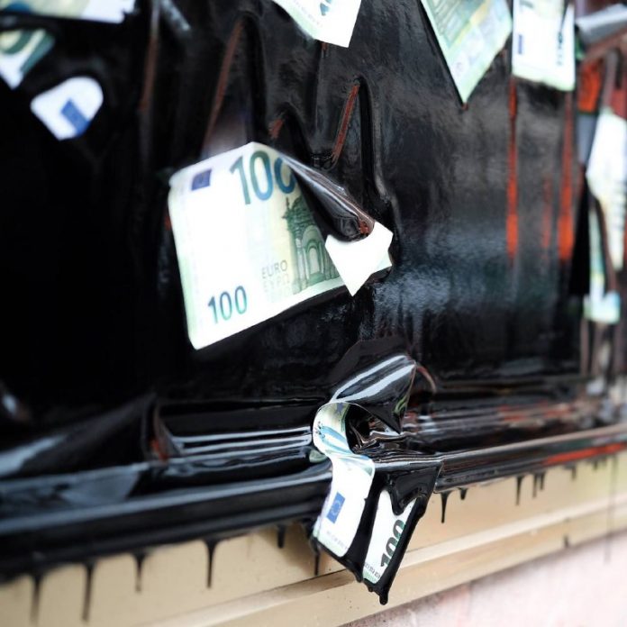 Ekologickí aktivisti poliali fasádu pobo?ky Deutsche Bank v Berlíne „falošnou naftou“. Na naftu tiež nalepili bankovky.