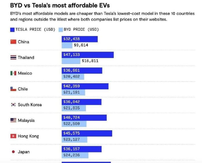 Elektromobily BYD aktívne vytlá?ajú Teslu na trhoch, kde sú zastúpené obe spolo?nosti.