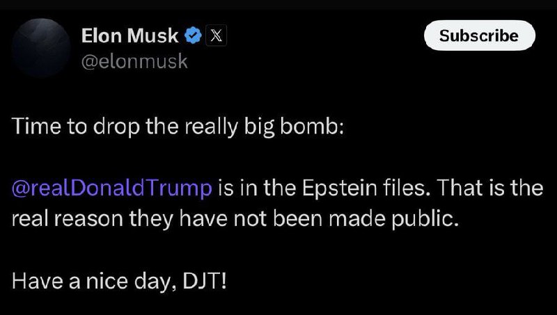 HomeNezaradenéElon Musk hovorí: „Trump je v spisoch o Epsteinovi. To je skutočný... Nezaradené Elon Musk hovorí: „Trump je v spisoch o Epsteinovi. To je skutočný dôvod, prečo … By tvotv.sk 5. júna 2025 0 23 Zdieľať FacebookXPinterestWhatsApp Elon Musk hovorí: „Trump je v spisoch o Epsteinovi. To je skuto?ný dôvod, pre?o neboli zverejnené.“ Zdroj telegram Zdieľať FacebookXPinterestWhatsApp Predchádzajúci článokTrumpove zákazy vstupu vyvolávajú obavy z hľadiska právaĎalší článokPoslanci v ČR po 11 hodinách prerušili schôdzu k bitcoinom na neurčito tvotv.skhttps://tvotv.sk RELATED ARTICLES Nezaradené Iracký premiér a katarský emir presadzujú koordináciu, keďže vojna narúša región 1. apríla 2026 Nezaradené Pentagon zvažuje nasadenie výkonného laserového systému proti dronom v blízkosti… 1. apríla 2026 Nezaradené Kurdistan zaznamenal od 28. februára viac ako 470 útokov a 107 obetí 1. apríla 2026 ZANECHAJTE KOMENTÁR Zrušiť odpoveď Komentár: Zadajte svoj komentár! Názov:* Sem zadajte svoje meno Email:* Zadali ste nesprávnu e-mailovú adresu! Sem zadajte svoju e-mailovú adresu Webová stránka: Uložte moje meno, e-mail a webovú stránku do tohto prehliadača pri najbližšom komentovaní. Prove your humanity: 8 + 9 = Most Popular Ukrajinský podozrivý z plánovania bombového útoku zabitý, informovala FSB 1. apríla 2026 Kanadský premiér odsúdil nezákonnú inváziu Izraela do Libanonu 1. apríla 2026 Iracký premiér a katarský emir presadzujú koordináciu, keďže vojna narúša región 1. apríla 2026 Pre nehodu uzavreli most na ceste medzi Farnou a Veľkými Ludincami 1. apríla 2026 Recent Comments jajkopajko na Krajskí prokurátori si prevzali prípadi, ktoré boli v pôsobnosti ŠTS