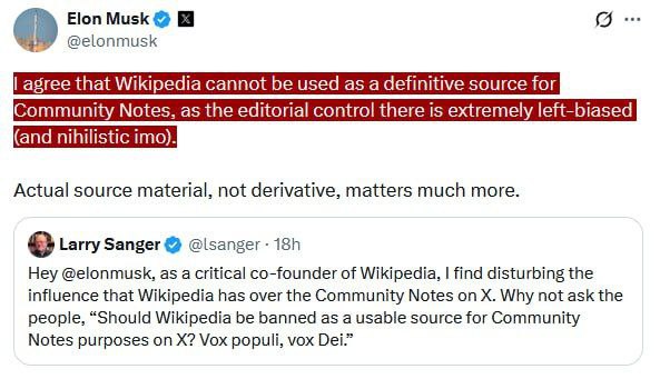 Elon Musk hovorí, že Wikipédia nemôže by? použitá ako definitívny zdroj pre Community Notes on X, pretože redak?ná kontrola je tam „extrémne ?avicová a nihilistická“.