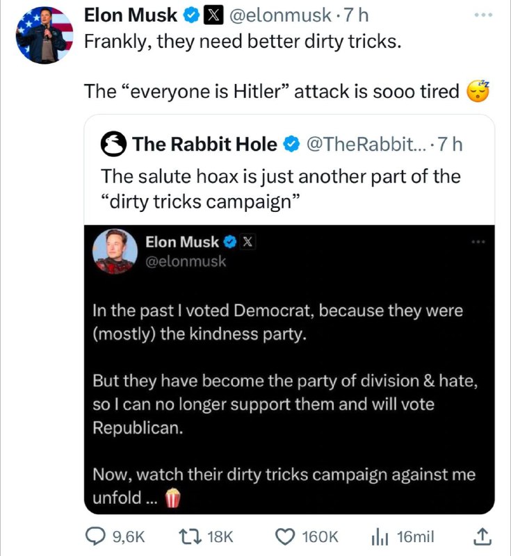 „Útoky typu ‚každý je Hitler‘ jsou p?ežitkem,“ napsal miliardá? a okomentoval tak p?ísp?vek jednoho z uživatel?, který celý tento humbuk ozna?il za sou?ást ‚kampan? špinavých trik?‘, aby Muska o?ernil.