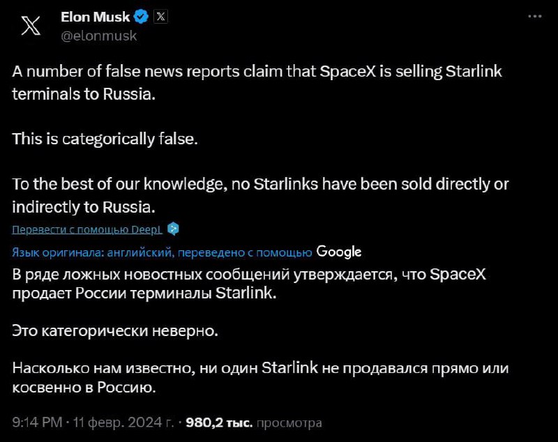 HomeNezaradenéElon Musk popiera dodávky satelitov Starlink ruskej armáde„Pokiaľ vieme, žiadny Starlink nebol... Nezaradené Elon Musk popiera dodávky satelitov Starlink ruskej armáde„Pokiaľ vieme, žiadny Starlink nebol predaný priamo ani nepriamo Rusku,“ povedal podnikateľ.Už skôr s… By ZEMaVEK 12. februára 2024 0 23 Zdieľať FacebookXPinterestWhatsApp Elon Musk popiera dodávky satelitov Starlink ruskej armáde „Pokia? vieme, žiadny Starlink nebol predaný priamo ani nepriamo Rusku,“ povedal podnikate?. Už skôr sa online šírili fotografické dôkazy o prítomnosti týchto satelitov vo výzbroji ruských ozbrojených síl. | odber Zdroj telegram Zdieľať FacebookXPinterestWhatsApp Predchádzajúci článokV Gemerskej knižnici budú môcť čitatelia na Valentína darovať knihyĎalší článokOpozíciu neprekvapila výzva na odvolanie J. Mikasa ZEMaVEK RELATED ARTICLES Nezaradené EÚ zatiaľ nedostatok leteckého paliva údajne nepociťuje, no pre dôsledky vojny v… 15. apríla 2026 Nezaradené Nemecký kamikadze dron „nie je nebezpečný ani pre nafukovacie tanky“, tvrdia médiá 15. apríla 2026 Nezaradené India hľadá tanker na nakládku ruského LPG – Reuters 15. apríla 2026 Most Popular EÚ zatiaľ nedostatok leteckého paliva údajne nepociťuje, no pre dôsledky vojny v… 15. apríla 2026 Prijali vyššie normy na ochranu pracovníkov pred nebezpečnými látkami 15. apríla 2026 Nemecký kamikadze dron „nie je nebezpečný ani pre nafukovacie tanky“, tvrdia médiá 15. apríla 2026 Výbor na kontrolu SIS nerokoval o Pellegriniho ceste z roku 2020 15. apríla 2026 Recent Comments jajkopajko na Krajskí prokurátori si prevzali prípadi, ktoré boli v pôsobnosti ŠTS