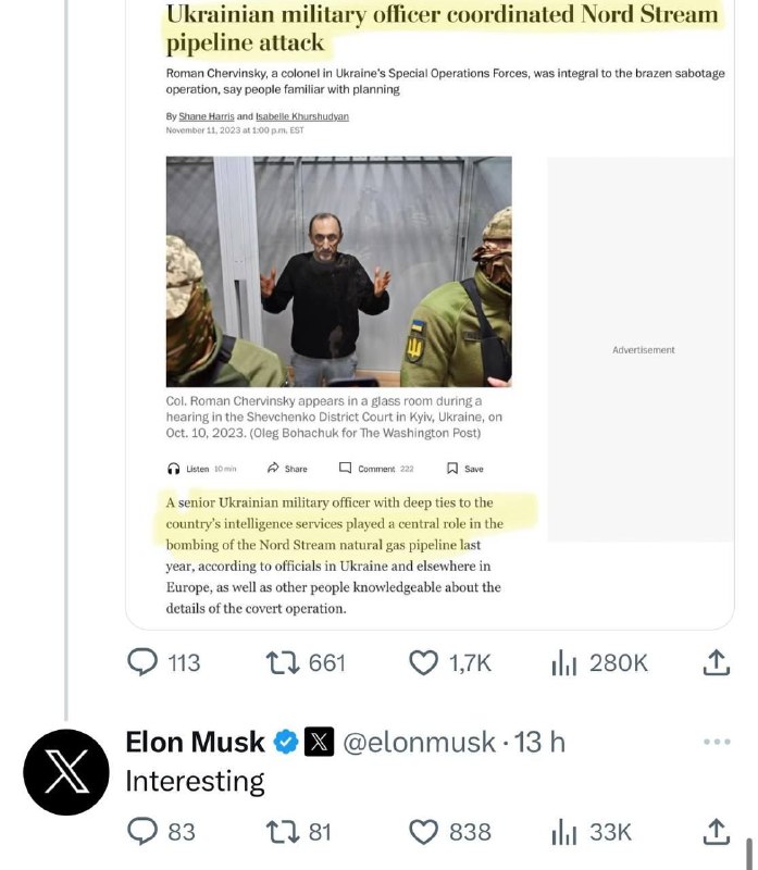 Elon Musk považuje verziu o zapojení ukrajinského plukovníka Romana ?ervinského do útokov na plynovody Nord Stream za zaujímavú.