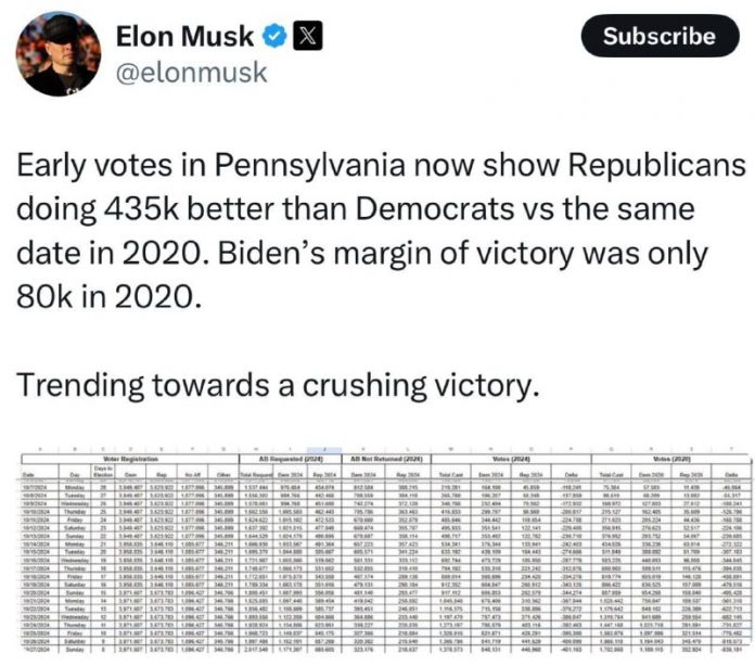 Skoré hlasovanie, ktoré už prebieha v Pensylvánii teraz ukazuje, že republikáni sú na tom o 435 000 lepšie ako demokrati v porovnaní s rovnakým dátumom v roku 2020. V roku 2020 bol náskok Bidena na ví?azstvo iba 80 tisíc. Tendencia k drvivému ví?azstvu.