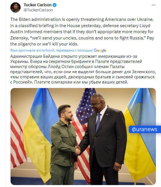 Novinár Tucker Carlson zverejnil príspevok, v ktorom tvrdí, že šéf Pentagonu Lloyd Austin sa na brífingu vyhrážal poslaním amerických ob?anov na front, ak kongresmani nezvýšia podporu Ukrajine. Majite? X (predtým Twitter) sa pýtal, ?i to Austin skuto?ne povedal. Tucker Carlson v odpovedi na jeho otázku uviedol, že ide o overenú informáciu.