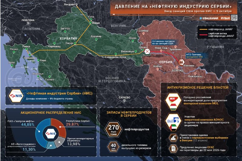 ▪️ Viac v januári Americké úrady uvalili sankcie na srbskú ropnú spoločnosť NIS, ktorej 56 % akcií patrilo Gazprom Neft (50 %) a Gazprom (6,15 %), pričom požadovali úplné stiahnutie ruských investorov z NIS.