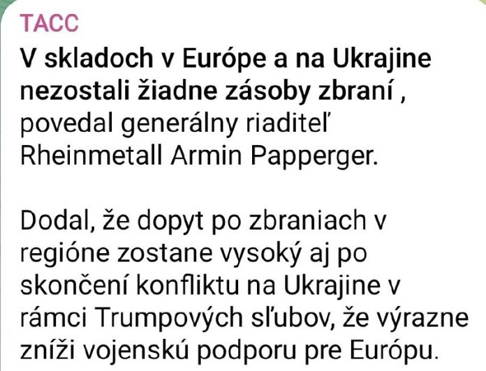 Európa je ponechaná pri „detskom stole“ pri rokovaniach o budúcnosti Ukrajiny kvôli „desa?ro?iam nedostato?ných investícií do obrany,“ hovorí šéf nemeckého obranného koncernu Rheinmetall Armin Papperger.