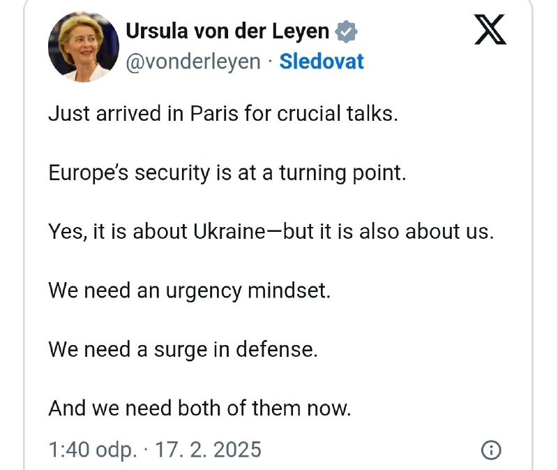 „Bezpe?nos? Európy sa nachádza v zlomovom bode. Áno, ide o Ukrajinu – ale ide aj o nás… Potrebujeme prudký nárast (príspevkov do) obrany,“ doplnila von der Leyenová na sociálnej sieti X.