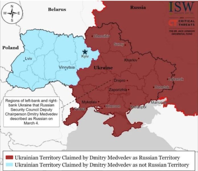 Ex prezident RF D. Medvedev 7. marca 2024 zverejnil hranicu, na ktorej sa Rusi vo svojom útoku zastavia No, len dodám. Putin povedal, že Kyjev je ruské mesto Takže toto sú skôr sny Západu