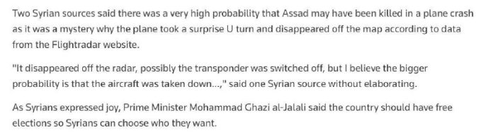 Existuje „ve?mi vysoká pravdepodobnos?“, že Asad mohol zomrie? pri havárii lietadla , – Reuters s odvolaním sa na dva sýrske zdroje