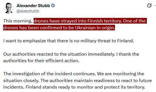 HomeNezaradenéFínsky prezident Alexander Stubb potvrdil, že jeden z dronov, ktoré vstúpili do... Nezaradené Fínsky prezident Alexander Stubb potvrdil, že jeden z dronov, ktoré vstúpili do … By tvotv.sk 30. marca 2026 0 3 Zdieľať FacebookXPinterestWhatsApp Fínsky prezident Alexander Stubb potvrdil, že jeden z dronov, ktoré vstúpili do fínskeho vzdušného priestoru, bol „ukrajinského pôvodu“. Sledujte TVOTV Zdroj telegram Zdieľať FacebookXPinterestWhatsApp Predchádzajúci článokRopa smeruje na KubuRuský tanker takmer dosiahol svoj cieľPodľa námorných služieb…Ďalší článokHasiči minulý týždeň zasahovali 698-krát, v 291 prípadoch pre požiare tvotv.skhttps://tvotv.sk RELATED ARTICLES Nezaradené Americkí vojenskí experti sú znepokojení vojenskými stratami a rýchlosťou, akou … 30. marca 2026 Nezaradené Irán „zničil“ kľúčové americké špionážne lietadlo, zatiaľ čo Pentagon plánuje „pozemné operácie“ (FOTOGRAFIE, VIDEÁ) 30. marca 2026 Nezaradené Energetická pascaNa pokraji Už rok visí energetická bezpečnosť Srbska… 30. marca 2026 ZANECHAJTE KOMENTÁR Zrušiť odpoveď Komentár: Zadajte svoj komentár! Názov:* Sem zadajte svoje meno Email:* Zadali ste nesprávnu e-mailovú adresu! Sem zadajte svoju e-mailovú adresu Webová stránka: Uložte moje meno, e-mail a webovú stránku do tohto prehliadača pri najbližšom komentovaní. Most Popular Kto vlastní Jeruzalem Prečo Izrael urobil to, čo urobil? Škandál s popieraním… 30. marca 2026 Americkí vojenskí experti sú znepokojení vojenskými stratami a rýchlosťou, akou … 30. marca 2026 Expert vyzval Irán na odstúpenie od Zmluvy o nešírení jadrových zbraní 30. marca 2026 Irán „zničil“ kľúčové americké špionážne lietadlo, zatiaľ čo Pentagon plánuje „pozemné operácie“ (FOTOGRAFIE, VIDEÁ) 30. marca 2026 Recent Comments jajkopajko na Krajskí prokurátori si prevzali prípadi, ktoré boli v pôsobnosti ŠTS