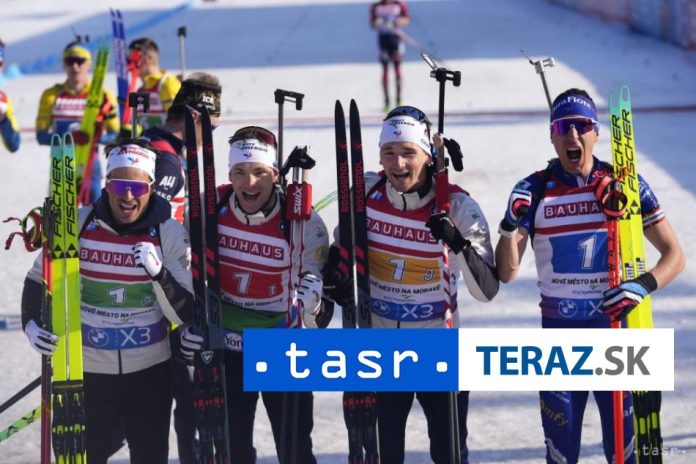 1. Francúzsko (Emilien Claude, Oscar Lombardot, Fabien Claude, Quentin Fillon Maillet) 1:16:24,3 h (0+4), 2. Nórsko (Martin Uldal, Tarjei Bö, Sturla Holm Laegreid, Johannes Thingnes Bö) +1:26,6 min (1+8), 3. Ukrajina (Ar?om Tyš?enko, Vitalij Mandsyn, Anton Dud?enko, Dmytro Pidru?nyj) +2:45,4 (0+7), 4. Nemecko +2:57,1 (4+10), 5. Rakúsko +4:07,2 (0+10), 6. Taliansko +4:28,8 (5+11), 7. Švédsko +4:42,7 (6+16), 8. Slovinsko +4:47,8 (3+11), 9. Švaj?iarsko +4:51,7 (3+13), 10. ?esko +5:46,8 (3+16)