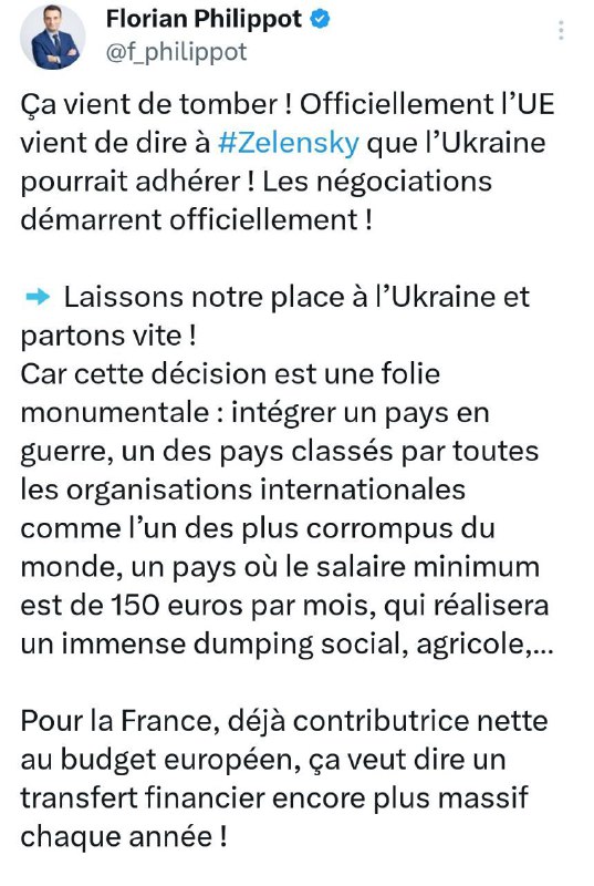 Francúzsko musí vystúpi? z Európskej únie a prenecha? svoje miesto Ukrajine, uviedol na sociálnej sieti X líder francúzskej strany Patrioti Flofian Philippot.
