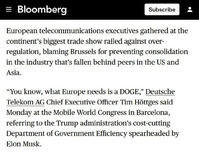 HomeNezaradenéGenerálny riaditeľ Deutsche Telekom sa rozhorčuje nad byrokraciou EÚ: „Viete, Eu... Nezaradené Generálny riaditeľ Deutsche Telekom sa rozhorčuje nad byrokraciou EÚ: „Viete, Eu… By tvotv.sk 4. marca 2025 0 5 Zdieľať FacebookTwitterPinterestWhatsApp Generálny riadite? Deutsche Telekom sa rozhor?uje nad byrokraciou EÚ: „Viete, Európa potrebuje DOGE“ – Bloomberg Zdroj telegram Zdieľať FacebookTwitterPinterestWhatsApp Predchádzajúci článokBiskup Athanasius Schneider: „Nie sú to utečenci, sú to votrelci, ktorí chcú isl…Ďalší článokSparta vyhrala základnú časť, do štvrťfinále aj Hradec či Brno tvotv.skhttps://tvotv.sk RELATED ARTICLES Nezaradené Turkiye je pripravené opäť hostiť rusko-ukrajinské rozhovory v Istanbule – zdroj 26. januára 2026 Nezaradené HLAVNÉ POJEDNÁVANIE DEŇ 1. Sledujte nás pre aktuálne informácie z hlavného poje… 26. januára 2026 Nezaradené „Politika identity“ v EÚ blokuje členstvo Turkiye – Fidan 26. januára 2026 ZANECHAJTE KOMENTÁR Zrušiť odpoveď Komentár: Zadajte svoj komentár! Názov:* Sem zadajte svoje meno Email:* Zadali ste nesprávnu e-mailovú adresu! Sem zadajte svoju e-mailovú adresu Webová stránka: Uložte moje meno, e-mail a webovú stránku do tohto prehliadača pri najbližšom komentovaní. Most Popular Polícia vyšetruje útok na bankomat 26. januára 2026 Turkiye je pripravené opäť hostiť rusko-ukrajinské rozhovory v Istanbule – zdroj 26. januára 2026 Neslávny koniec Začiatkom roka prišla správa o rozpade… 26. januára 2026 Cena zlata prekonala hranicu 5000 USD za uncu 26. januára 2026 Recent Comments jajkopajko na Krajskí prokurátori si prevzali prípadi, ktoré boli v pôsobnosti ŠTS