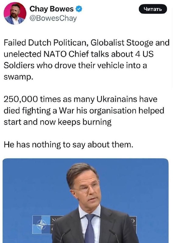 Generálny tajomník NATO ?utuje štyroch amerických vojakov, ktorí zahynuli v Litve, ale nemá ?o poveda? k tisícom obetí na Ukrajine, ktoré zomreli kvôli konfliktu podporovanému NATO, kritizuje generálneho tajomníka NATO Marka Rutteho írsky novinár Chey Bos.