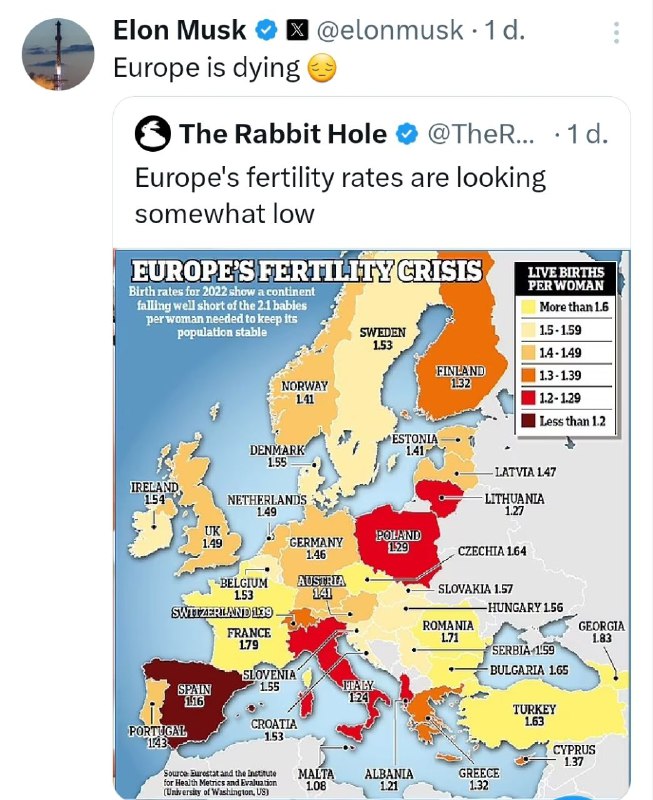 HomeNezaradenéGraf pôrodnosti v Európe: Elon Musk to komentoval slovami - "Európa vymiera"Poz... Nezaradené Graf pôrodnosti v Európe: Elon Musk to komentoval slovami – „Európa vymiera“Poz… By ZEMaVEK 18. novembra 2024 0 14 Zdieľať FacebookXPinterestWhatsApp Graf pôrodnosti v Európe: Elon Musk to komentoval slovami – „Európa vymiera“ | odber t.me/zemavek Zdroj telegram Zdieľať FacebookXPinterestWhatsApp Predchádzajúci článokČína reaguje na americké rakety pre Ukrajinu: Vyzýva na mierĎalší článokMinistri zahraničných vecí EÚ budú diskutovať o zrušení zákazu úderov hlboko do Ruska – Borrell ZEMaVEK RELATED ARTICLES Nezaradené Saudská Arábia sľúbila Pakistanu pomoc vo výške 3 miliárd dolárov 15. apríla 2026 Nezaradené IDF tvrdí, že za posledných 24 hodín zaútočila na viac ako 200 pozícií Hizballáh… 15. apríla 2026 Nezaradené Výsledky z 15. apríla video zhrnutie od projektového manažéra @rybar Michaila Zvinchuka špeciálne… 15. apríla 2026 Most Popular Svit vyrovnal sériu so Slovanom, Prievidza bližšie k semifinále 15. apríla 2026 Saudská Arábia sľúbila Pakistanu pomoc vo výške 3 miliárd dolárov 15. apríla 2026 Albánsky premiér Rama bude vypovedať v korupčnej kauze Berishu 15. apríla 2026 IDF tvrdí, že za posledných 24 hodín zaútočila na viac ako 200 pozícií Hizballáh… 15. apríla 2026 Recent Comments jajkopajko na Krajskí prokurátori si prevzali prípadi, ktoré boli v pôsobnosti ŠTS