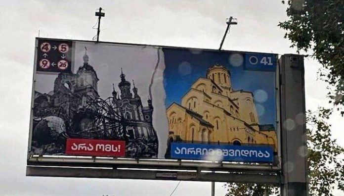 Gruzínsko v reakcii na ukrajinské protesty uviedlo, že bude na?alej používa? pouli?né transparenty zobrazujúce zni?ené ukrajinské mestá ved?a pokojných gruzínskych miest.