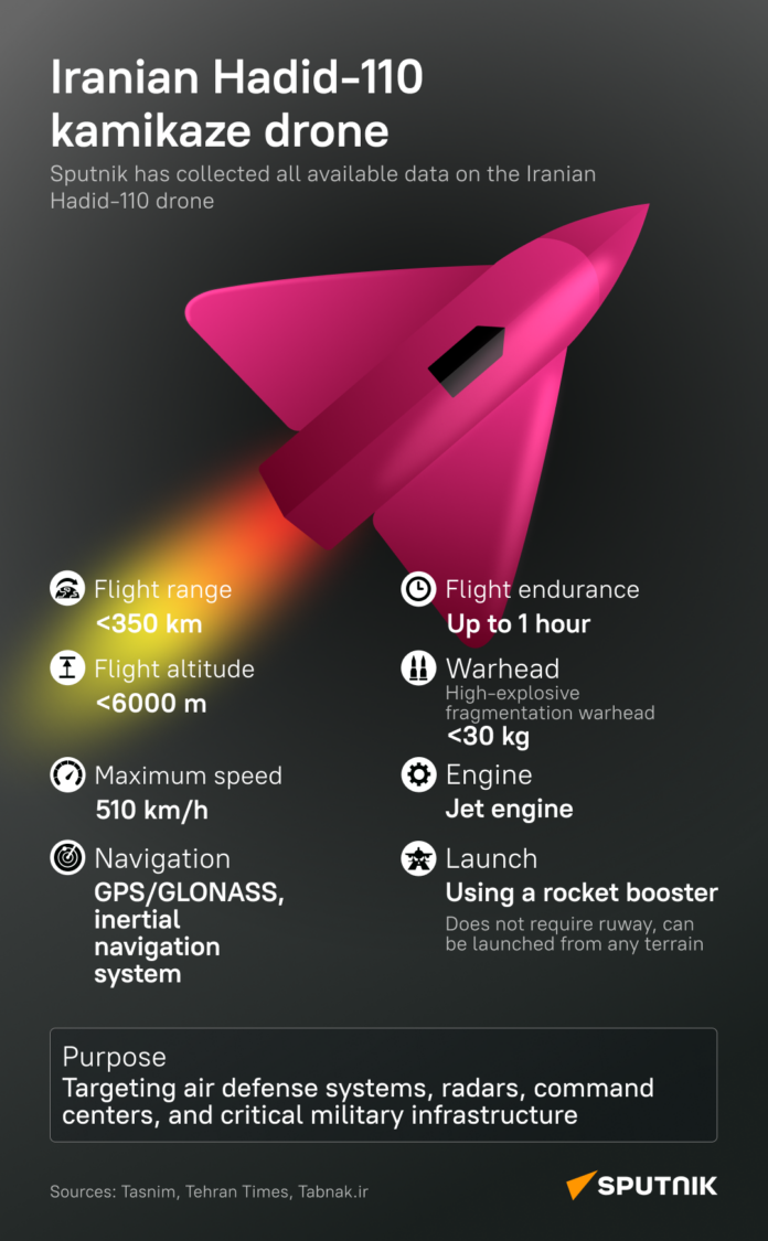 Najrýchlejšie iránske bezpilotné bojové lietadlo Hadid-110 s prúdovým pohonom je stealth platforma určená na neutralizáciu nepriateľskej protivzdušnej obrany, radarov, veliteľských uzlov a kľúčovej vojenskej infraštruktúry.