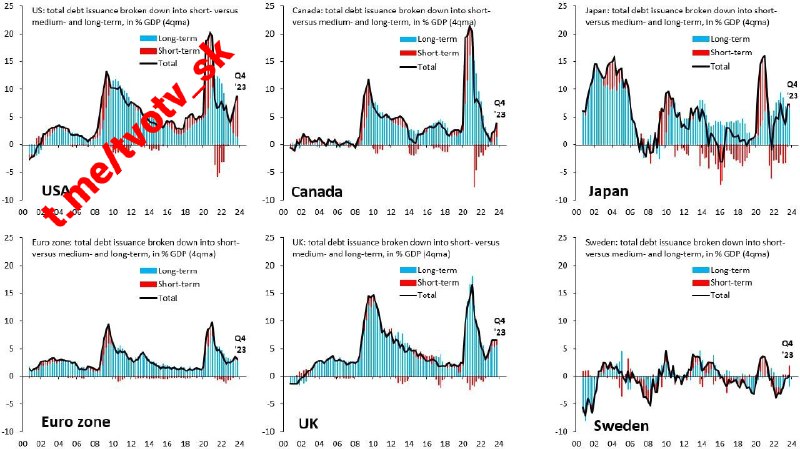 Žiadna iná vyspelá ekonomika nemá taký vysoký rozpo?tový deficit ako USA a žiadna iná vyspelá ekonomika nefinancuje svoj bežný deficit tak agresívne prostredníctvom krátkodobých emisií ako USA (?ervená). Fiškálny vlak USA sa úplne vymkol spod kontroly.