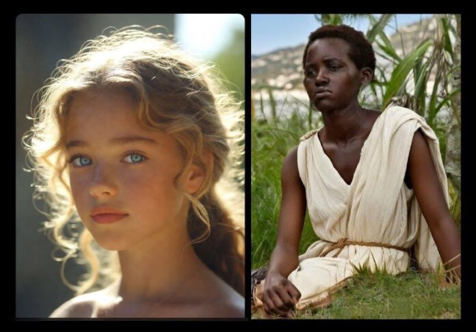 Lupita Nyong'o bola vybraná na stvárnenie spartskej princeznej, ktorá začala trójsku vojnu. Vľavo na obrázku je verzia podla Homera, vpravo je režisérova verzia.