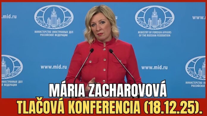 Slovenský dabing časti tlačovej konferencie hovorkyne Ministerstva zahraničných vecí Ruskej federácie Márie Zacharovovej z 18. decembra 2025.