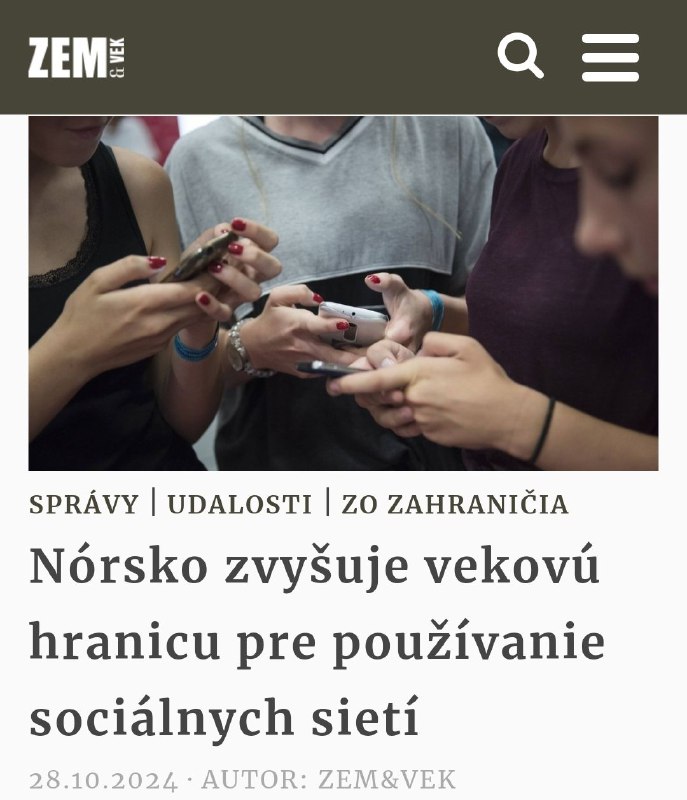 HomeNezaradenéhttps://zemavek.sk/norsko-zvysuje-vekovu-hranicu-pre-pouzivanie-socialnych-sieti... Nezaradené https://zemavek.sk/norsko-zvysuje-vekovu-hranicu-pre-pouzivanie-socialnych-sieti… By ZEMaVEK 29. októbra 2024 0 18 Zdieľať FacebookXPinterestWhatsApp https://zemavek.sk/norsko-zvysuje-vekovu-hranicu-pre-pouzivanie-socialnych-sieti/ | odber t.me/zemavek Zdroj telegram Zdieľať FacebookXPinterestWhatsApp Predchádzajúci článokObec Margecany plánuje postaviť denný stacionárĎalší článokNemecký podnikateľ a zakladateľ webovej stránky na zdieľanie súborov Megaupload … ZEMaVEK RELATED ARTICLES Nezaradené Amerika sa chytá do rovnakej pasce ako vo VietnameSúdiac podľa prejavov americke… 4. apríla 2026 Nezaradené VIDEO: Neďaleko Hormuzského prielivu sa po iránskom útoku zrútilo ďalšie americk… 3. apríla 2026 Nezaradené https://youtu.be/VQlWW2lzRLsPeter Sabela: VEĽKONOČNÝ ŠPECIÁL: Americká politika … 3. apríla 2026 ZANECHAJTE KOMENTÁR Zrušiť odpoveď Komentár: Zadajte svoj komentár! Názov:* Sem zadajte svoje meno Email:* Zadali ste nesprávnu e-mailovú adresu! Sem zadajte svoju e-mailovú adresu Webová stránka: Uložte moje meno, e-mail a webovú stránku do tohto prehliadača pri najbližšom komentovaní. Prove your humanity: 2 + 6 = Put your comment here Most Popular Amerika sa chytá do rovnakej pasce ako vo VietnameSúdiac podľa prejavov americke… 4. apríla 2026 Slovanistky zdolali Nitru 3:1 v prvom semifinále play off 4. apríla 2026 Izrael zabil šéfa iránskych raketových síl a zintenzívnil útoky 4. apríla 2026 SR upozorňuje na vážne následky situácie v Hormuzskom prielive 4. apríla 2026 Recent Comments jajkopajko na Krajskí prokurátori si prevzali prípadi, ktoré boli v pôsobnosti ŠTS