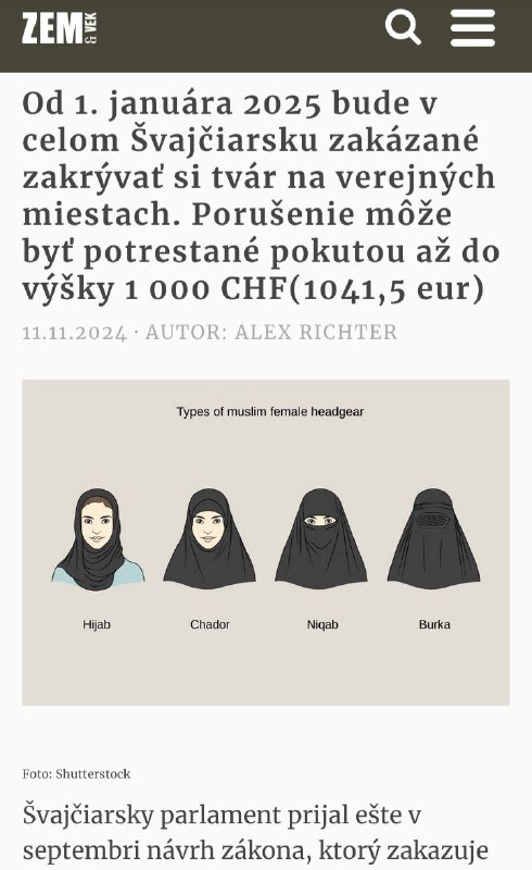HomeNezaradenéhttps://zemavek.sk/od-1-januara-2025-bude-v-celom-svajciarsku-zakazane-zakryvat-... Nezaradené https://zemavek.sk/od-1-januara-2025-bude-v-celom-svajciarsku-zakazane-zakryvat-… By ZEMaVEK 11. novembra 2024 0 17 Zdieľať FacebookXPinterestWhatsApp https://zemavek.sk/od-1-januara-2025-bude-v-celom-svajciarsku-zakazane-zakryvat-si-tvar-na-verejnych-miestach-porusenie-moze-byt-potrestane-pokutou-az-do-vysky-1-000-chf10415-eur/ Zdroj telegram Zdieľať FacebookXPinterestWhatsApp Predchádzajúci článokZačali sa Študentské dni nitrianskych univerzítĎalší článokSingles‘ Day stráca svoj lesk ZEMaVEK RELATED ARTICLES Nezaradené Iránsky minister zahraničných vecí obviňuje USA zo sabotáže Islamabadskej „takmer“ dohody 13. apríla 2026 Nezaradené https://www.infovojna.com/article/rusko-ponuka-usa-a-iranu-kluc-k-mierovej-dohod… 13. apríla 2026 Nezaradené Hizballáh útočí na izraelské osady počas izraelských útokov v južnom Libanone 13. apríla 2026 Most Popular Ukrajina zaútočila na ruský chemický závod v Čerepovci 13. apríla 2026 Iránske vojnové udalosti vedúce k 13. aprílu Trump stanovil nový termín -… 13. apríla 2026 Iránsky minister zahraničných vecí obviňuje USA zo sabotáže Islamabadskej „takmer“ dohody 13. apríla 2026 Slovenky prehrali v druhom zápase s Taliankami 4:6 13. apríla 2026 Recent Comments jajkopajko na Krajskí prokurátori si prevzali prípadi, ktoré boli v pôsobnosti ŠTS