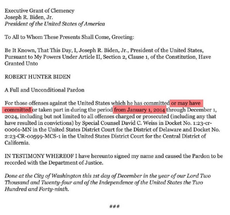 "Za zlo?iny proti Spojeným štátom, ktoré spáchal alebo mohol spácha? alebo sa na nich podie?al medzi 1. januárom 2014 a 1. decembrom 2024, vrátane, ale nie výlu?ne, všetkých obvinených alebo stíhaných trestných ?inov."