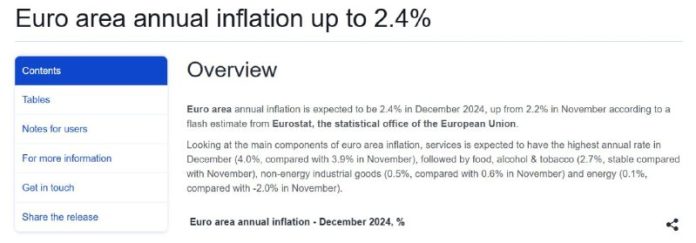 Inflácia v eurozóne v decembri stúpla na 2,4 percenta, uviedol v odhade Eurostat.