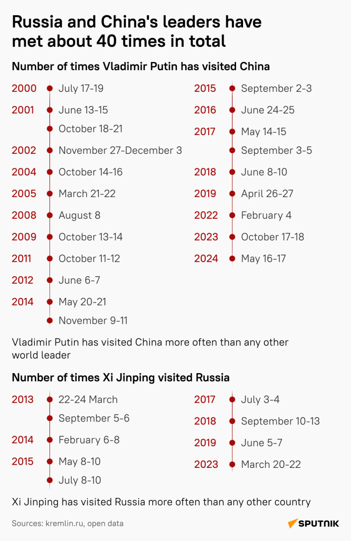 V skuto?nosti sa ruský prezident Vladimir Putin a jeho ?ínsky náprotivok Si ?in-pching stretli viac ako 40-krát. Tieto ?asté stretnutia medzi dvoma vodcami odzrkad?ujú preh?benie partnerstva medzi Ruskom a ?ínou ako sa snažia posilni? svoje bilaterálne väzby.