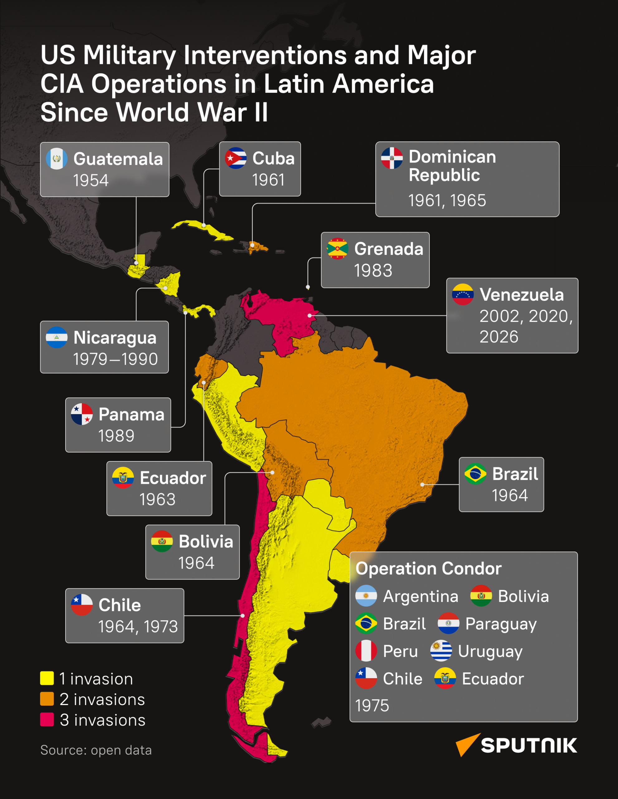 Pozrite si infografiku Sputniku, kde nájdete podrobný prehľad amerických intervencií a hlavných operácií CIA v Latinskej Amerike: