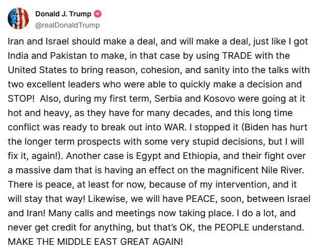 Irán a Izrael by mali uzavrie? dohodu — a aj ju uzavrú — rovnako ako som prinútil Indiu a Pakistan, aby uzavreli dohodu, v tom prípade pomocou OBCHODU so Spojenými štátmi, aby sme vniesli rozum, súdržnos? a zdravý rozum do rozhovorov s dvoma výbornými lídrami, ktorí boli schopní rýchlo sa rozhodnú? a zastavi? to!
