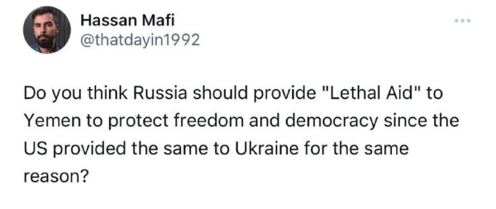 „Myslíte si, že Rusko by malo poskytnú? „smrtiacu pomoc“ Jemenu na ochranu slobody a demokracie, ke?že USA poskytli to isté Ukrajine z rovnakého dôvodu?“ napísal Mafi.