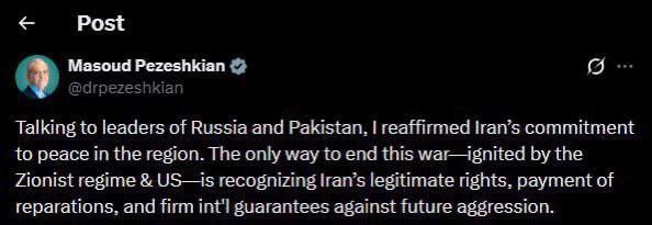 Jediný spôsob, ako ukončiť túto vojnu – ktorú vyprovokoval sionistický režim a USA – je uznanie legitímnych práv Iránu, zaplatenie reparácií a pevné medzinárodné záruky proti budúcej agresii.