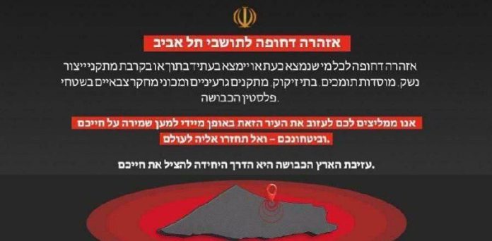 „Naliehavé varovanie pre všetkých, ktorí sa v sú?asnosti alebo sa budú nachádza? v blízkosti zariadení na výrobu zbraní, pomocných inštitúcií, rafinérií, jadrových zariadení a vojenských výskumných ústavov na okupovaných palestínskych územiach.“