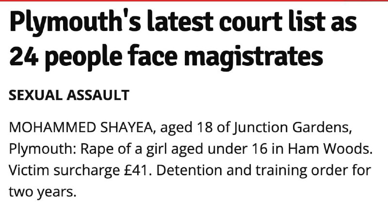 Osemnás?ro?ný Mohammed Shahei z Plymouthu týral diev?a mladšie ako 16 rokov. V ?ase ?inu bola osoba arabského pôvodu maloletá. V dôsledku toho bol použitý rokovací poriadok, ktorý platí pre páchate?ov vo veku 12 – 17 rokov. Bol odsúdený na dva roky väzenia a tiež na príspevok do fondu obetí násilia vo výške zhruba dvoch tisíc Sk.