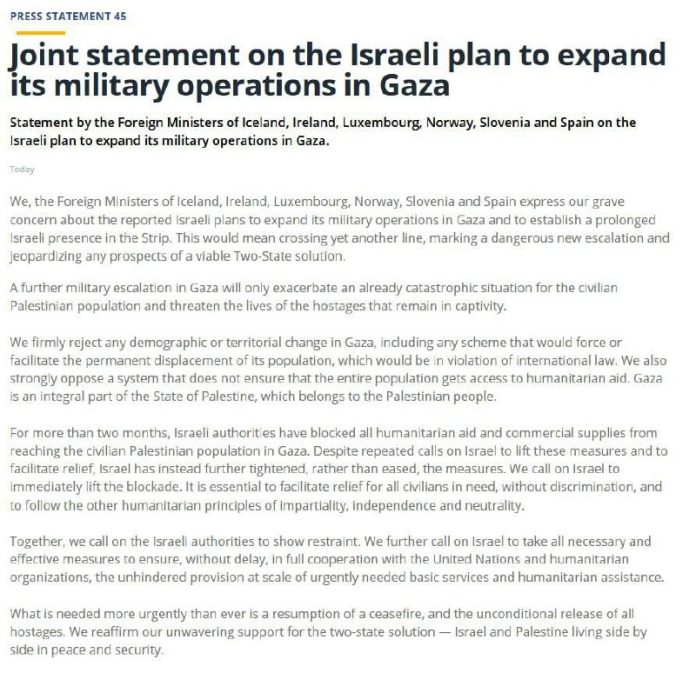 Island, Írsko, Luxembursko, Nórsko, Slovinsko a Španielsko spolo?ne vyhlásili, že „rozhodne odmietajú akéko?vek demografické alebo územné zmeny v Gaze vrátane akéhoko?vek plánu, ktorý by vynútil trvalé vysídlenie Palestín?anov“.