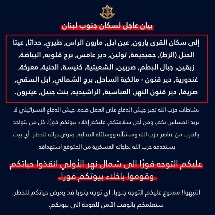 Arabský mediálny zástupca IDF plukovník Avichai Adray nariadil (!) obyvate?om 29 libanonských dedín blízko hraníc s Izraelom, aby okamžite opustili svoje domovy a vydali sa na sever, zatia? k rieke Al-Awali (rieka v južnom Libanone). Nesmie cestova? na juh.