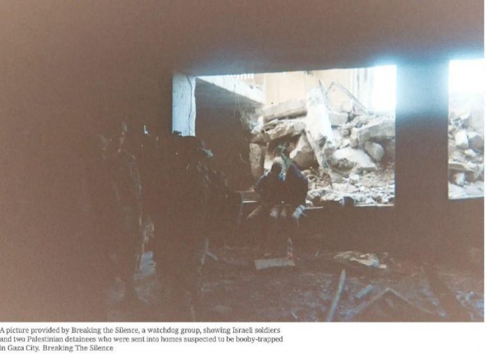 Vyšetrovanie New York Times odha?uje, že izraelské sily bežne používali zadržiavaných Palestín?anov ako ?udské štíty po?as vojenských operácií v Gaze, ?o je prax, ktorá porušuje izraelské aj medzinárodné právo. Najmenej 11 jednotiek v piatich mestách prinútilo palestínskych civilistov vykonáva? nebezpe?né úlohy, ako je vyh?adávanie výbušnín a navigácia v tuneloch Hamasu, aby ochránili izraelských vojakov pred zranením.