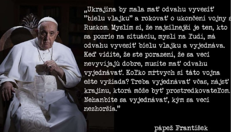 HomeNezaradenéJa to hovorím už rok a pol verejne, teraz sa pridal aj... Nezaradené Ja to hovorím už rok a pol verejne, teraz sa pridal aj pontifik Ukrajina by mala vyvesiť bielu vlajku a rokovať o mieri … By losbastardos 10. marca 2024 0 17 Zdieľať FacebookXPinterestWhatsApp Ja to hovorím už rok a pol verejne, teraz sa pridal aj pontifik Ukrajina by mala vyvesi? bielu vlajku a rokova? o mieri Zdroj telegram Zdieľať FacebookXPinterestWhatsApp Predchádzajúci článokDPB vníma miernu stabilizáciu stavu vodičov, naďalej ich však hľadáĎalší článokDve desaťročia diplomacie:Ako ruský minister zahraničia oslavuje Sergej Lavrov dve desaťročia na čele ruskej diplomacie. Jeho pôsobenie sa vyznačuje nielen str… losbastardoshttps://dennikn.news RELATED ARTICLES Nezaradené Kronika špeciálnej vojenskej operácie z 29. apríla 2026Ruské jednotky na… 29. apríla 2026 Nezaradené Bývalý sovietsky štát odsúdil opozičného politika na 19 rokov väzenia 29. apríla 2026 Nezaradené Výsledky z 29. apríla video zhrnutie od projektového manažéra @rybar Michaila Zvinchuka špeciálne… 29. apríla 2026 Most Popular Hakimi vynechá pre zranenie odvetu semifinále na pôde Bayernu 30. apríla 2026 Slovensko podalo žalobu na Súdny dvor EÚ kvôli rozhodnutiu Európskej únie zakáza… 30. apríla 2026 V Hebrone na Západnom brehu izraelská armáda zabila tínedžera 30. apríla 2026 USA prvýkrát za desaťročia zažívajú stagfláciu – prorok krachu z roku 2008 30. apríla 2026 Load more Recent Comments jajkopajko na Krajskí prokurátori si prevzali prípadi, ktoré boli v pôsobnosti ŠTS