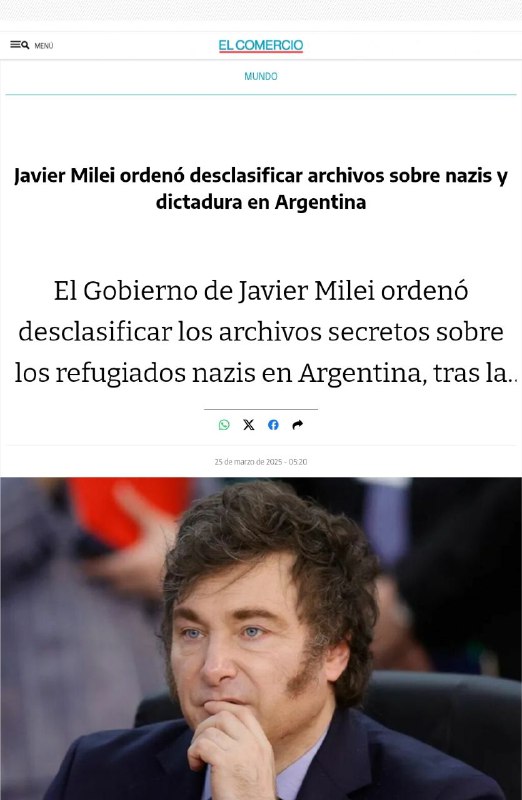 "Argentínsky prezident Javier Miley nariadil odtajnenie všetkých dokumentov týkajúcich sa nacistov, ktorí utiekli do juhoamerickej krajiny po druhej svetovej vojne."