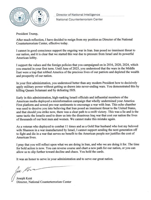 Prezidentove komentáre prišli v čase, keď Kent napísal otvorený list, v ktorom vysvetľoval svoje rozhodnutie rezignovať a uviedol, že USA boli donútené ísť do vojny „kvôli tlaku Izraela a jeho mocnej americkej loby“ a že Trump bol oklamaný provojnovou „dezinformačnou kampaňou“.