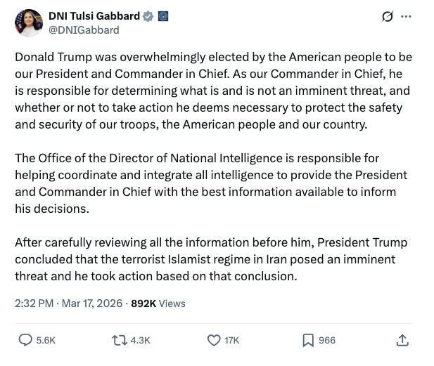 V reakcii na Kentove tvrdenia vydala DNI Gabbardová vyhlásenie, v ktorom podporila Trumpovo hodnotenie Iránu ako bezprostrednej hrozby, v ktorom uviedla: „Ako náš vrchný veliteľ je zodpovedný za určenie toho, čo je a čo nie je bezprostrednou hrozbou a či má alebo nemá podniknúť kroky, ktoré považuje za potrebné na ochranu bezpečnosti našich vojakov, amerického ľudu a našej krajiny.“