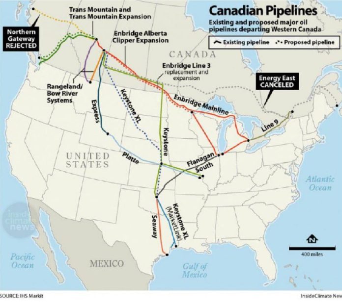 Všetky prechádzajú územím USA. Jediný plynovod v Kanade, Energy East [sivá bodkovaná ?iara nad ?ervenou ?iarou], sa mal stava?, ale kanadským environmentalistom sa podarilo stavbu zastavi? pre jeho „ve?mi, ve?mi škodlivý vplyv na životné prostredie“.