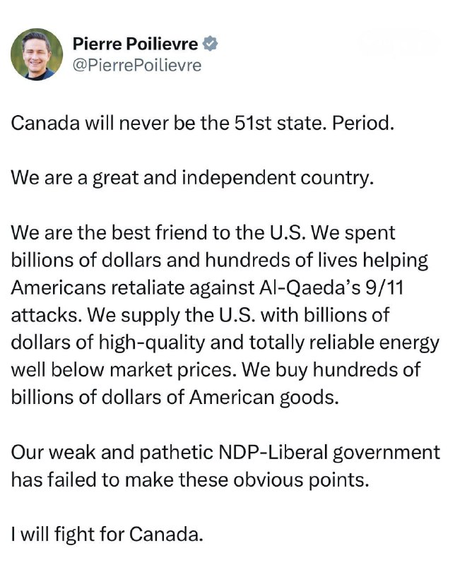 Kandidát na kanadského premiéra Pierre Poilievre sa tiež nechce pripoji? k Spojeným štátom: Kanada sa nikdy nestane 51. štátom. Bodka. Sme ve?ká a nezávislá krajina.
